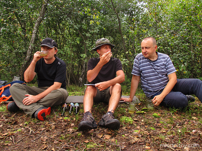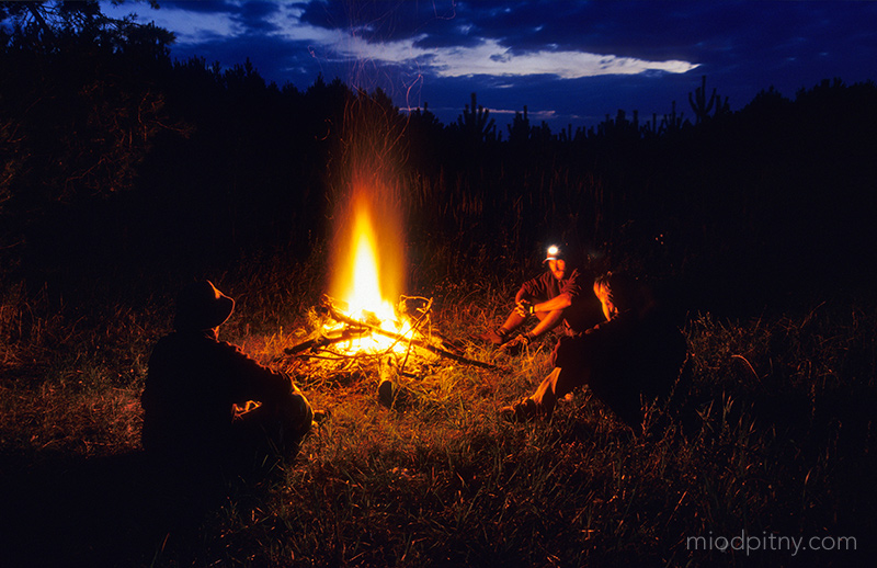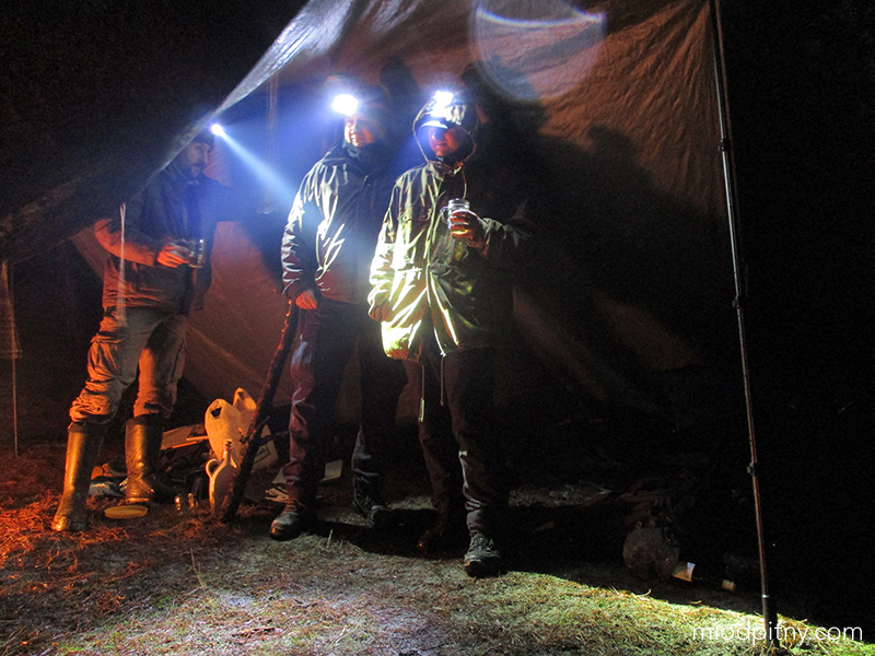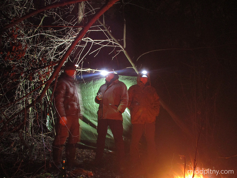 Mieliśmy spory przestój w kosztowaniu miodów, bo Piotr ugrzązł za granicą. Oto zdjęcie z jedenego z ostatnich miodowych spotkań bushcraftowych, podczas którego wychyliliśmy 3 znakomite miody: Dwójniak Niepodległościowy z Pasieki Jaros, Trójniak Tango z Mango od Imbiorowicza oraz Trójniak Wieśniak od Piwowara. Pogoda nas nie rozpieszczała, bo wiało i padało więc walczyliśmy aby utrzymać przy życiu ognisko. Ale takie warunki są najlepsze do kosztowania miodu grzanego. Smakuje nieporównywalnie lepiej niż przed kominkiem w bamboszach.