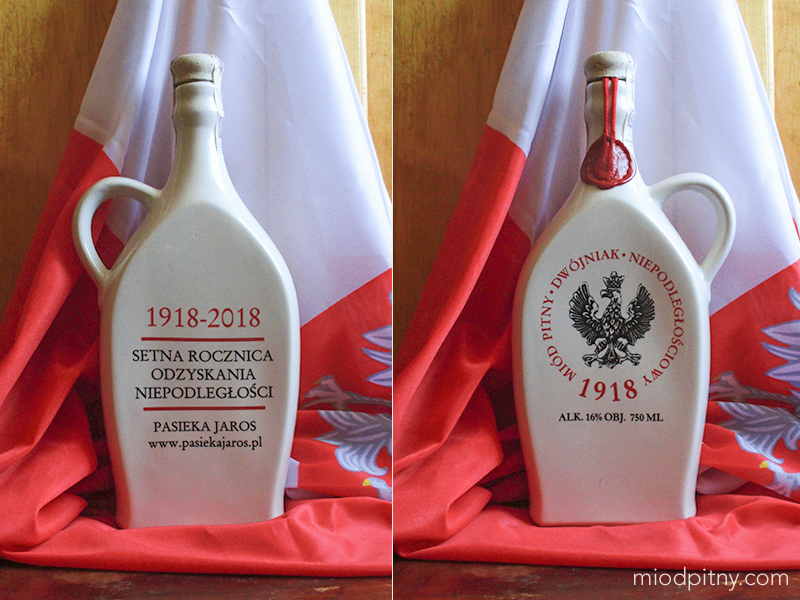 Właśnie otrzymaliśmy przesyłkę z Pasieki Jaros, a w niej wielce unikatowy miód pitny, utworzony specjalnie z okazji rocznicy odzyskania niepodległości. Jest to limitowana edycja 308 butelek ceramicznych o pojemnosci 750ml, w cenie 100 złociszy. Dzięki uprzejmości Pasieki Jaros mogliśmy zakupić jedną z ostatnich już sztuk. Oto co pisze producent na jego temat: "Jest to miód pitny, pierwszy w historii naszej firmy, zrobiony z użyciem chmielu. Do produkcji użyliśmy wiele gatunków miodu oraz cztery różne odmiany chmielu. Potem klasycznie leżakowanie, w tym przypadku około 4 lata. Uzyskaliśmy w ten sposób bardo ciekawy smakowo miód pitny, gdzie goryczka i aromat chmielu równoważny słodycz użytych miodów pszczelich. ."